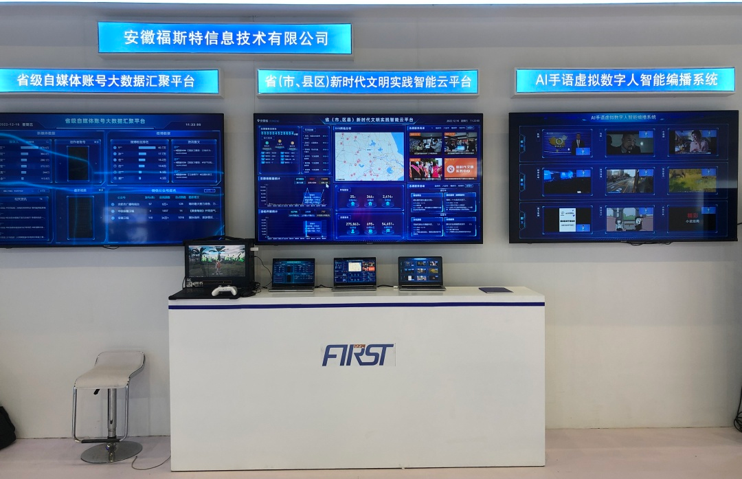 安徽福斯特信息技術有限公司此次應邀參展,以廣電媒體發展為亮點,集中展示大數據、人工智能呈現了AI-VLOG視頻智能合成系統+AI手語虛擬數字人智能編播系統+省級自媒體賬號大數據匯聚平臺+省(市、縣區)新時代文明實踐智能云平臺技術。